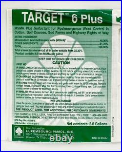 MSMA Target 6 Plus Herbicide 2.5 Gallon. As shown in the pictures Part Number: N/A Size: 2.5 Gallon Quantity: 1 Color: N/A UPC: N/A Packaging: N/A.