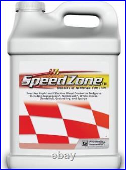 Speedzone Herbicide EW - 2.5 Gallons. Provides exceptional broadleaf weed control - fast. In university and cooperator tests SpeedZone applications have repeatedly controlled tough weeds like clover, plantain, ground ivy and spurge with a fast-acting cool-weather response exhibiting injury within hours. SpeedZone contains an advanced chemistry for broadleaf weed control in turf. The mode of action inhibits a key enzyme in chlorophyll production.